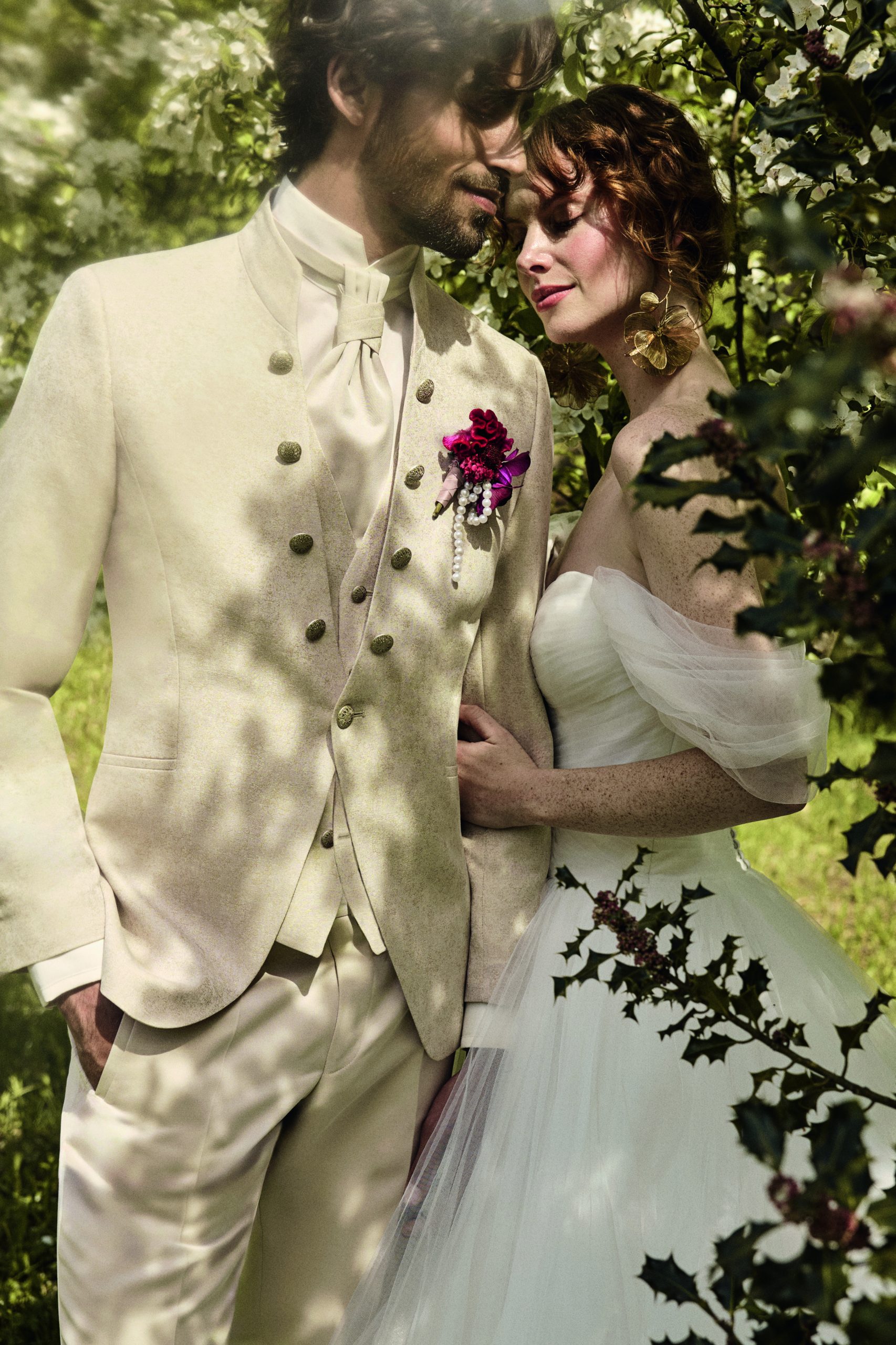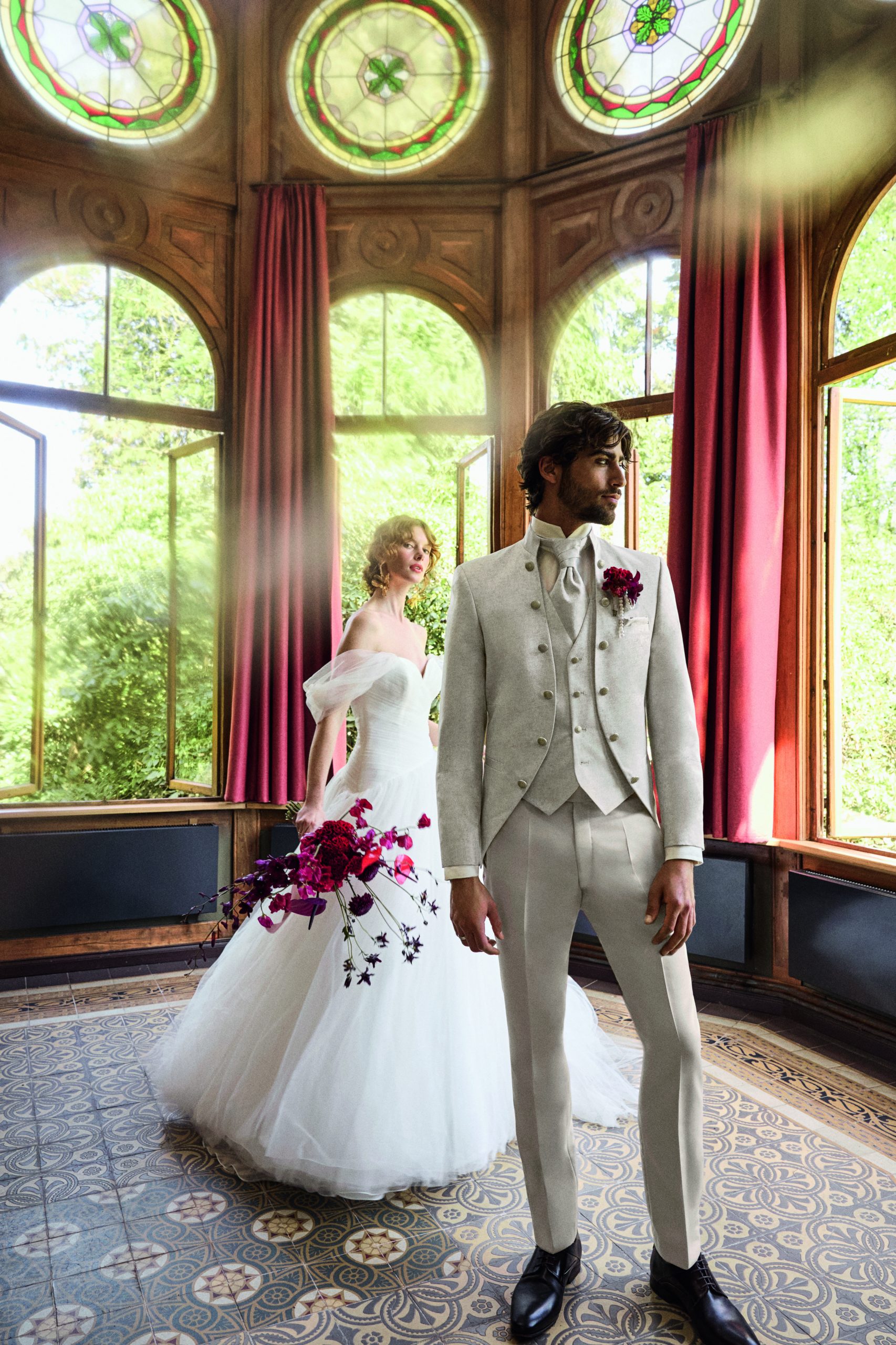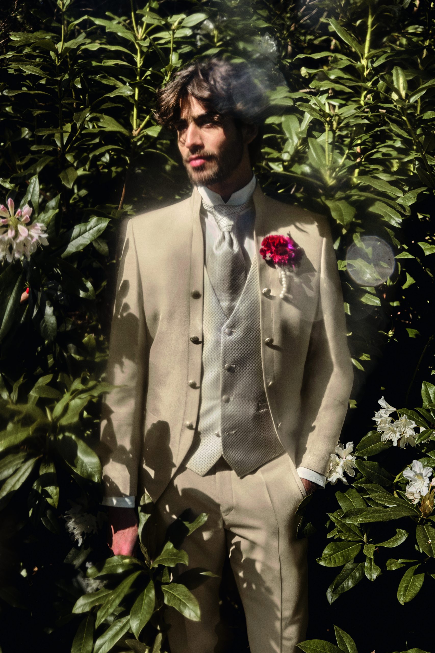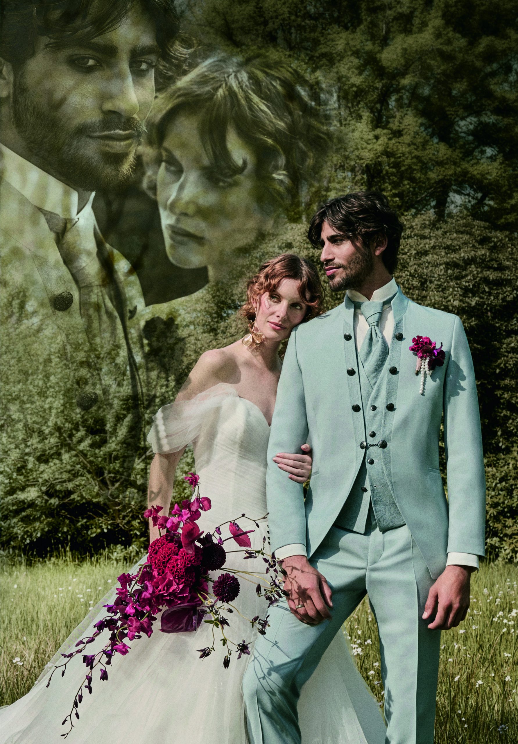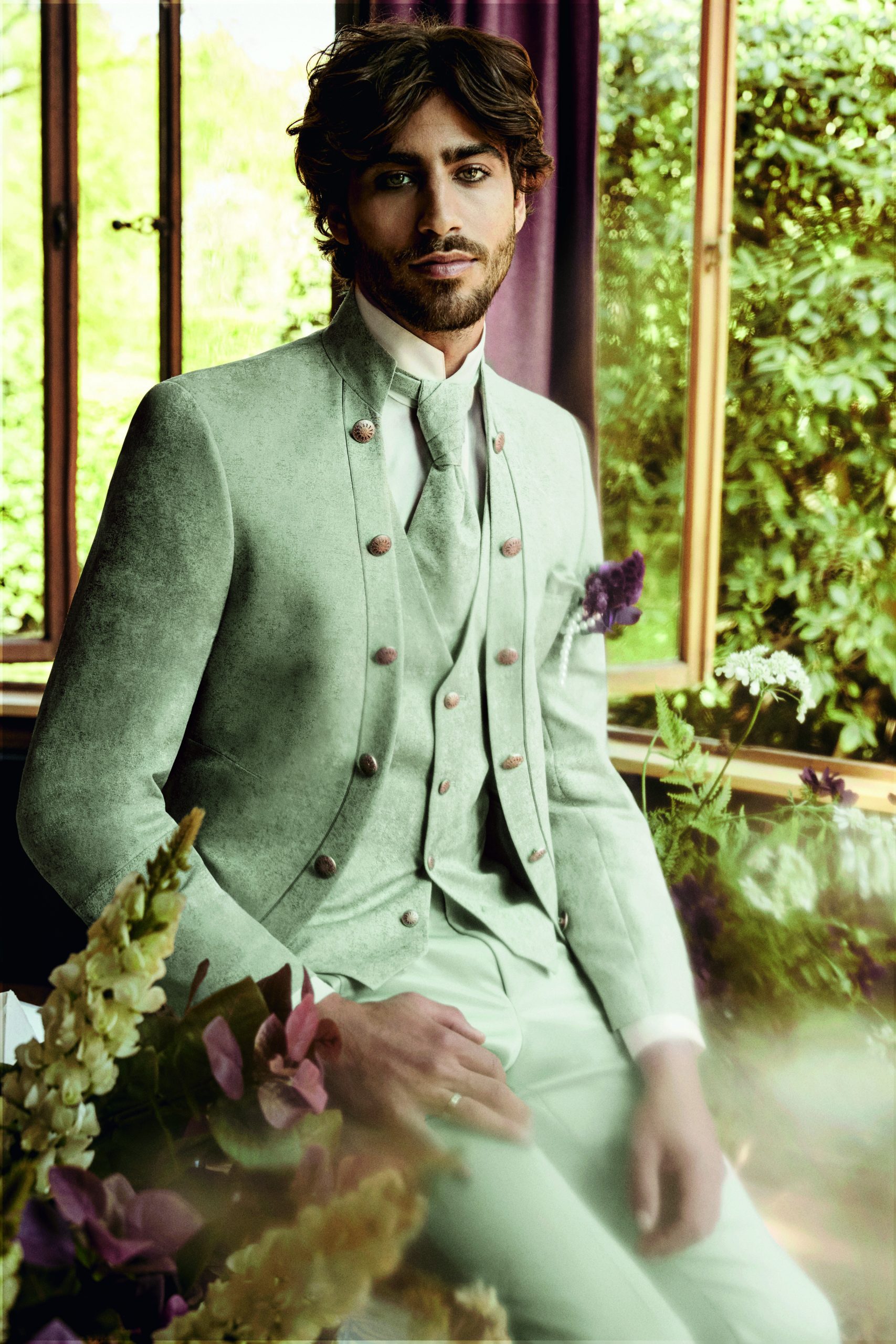 Eleganter Herrenanzug in Mintgrün von Tziacco, getragen im Outdoor-Setting vor historischen Mauern – exklusiver Hochzeitsanzug erhältlich bei Stesa Herrenausstatter Lörrach